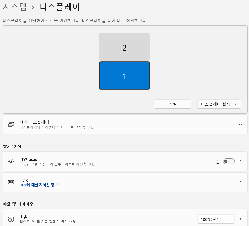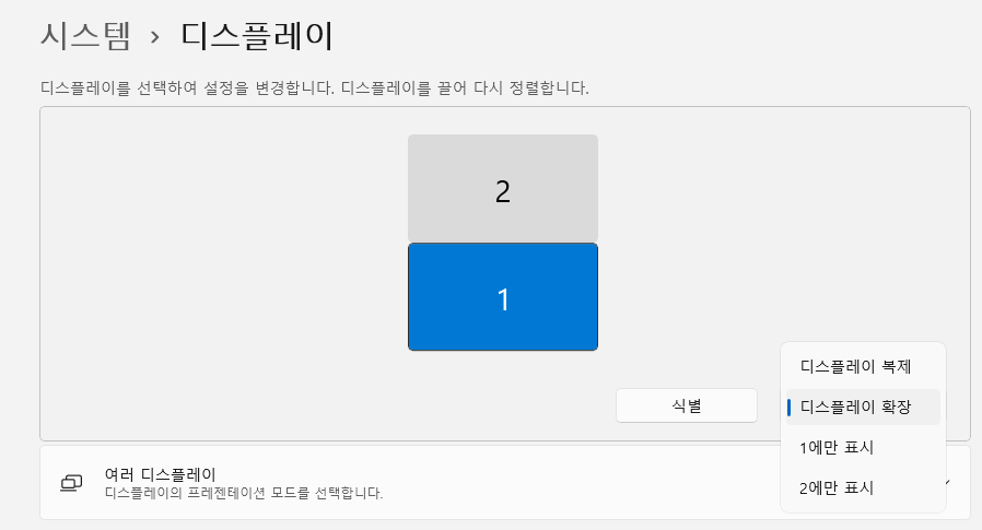 식별 버튼을 누르면 현재 모니터의 번호가 확인가능하다. 그래도 모니터 확인이 안된다면 고급디스플레이에서 모니터의 번호가 확인가능하다.