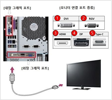 그중에서 모니터연결포트는 DVI, RGV, HDMI, DP, TYPE C등이 있다.