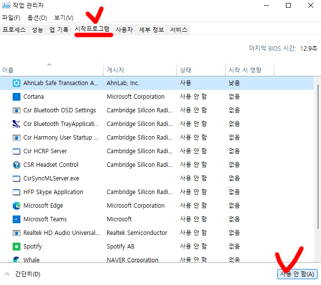 시작 > 작업관리자 클릭(아...캡쳐하기 귀찮다... 말로 설명해야지)
